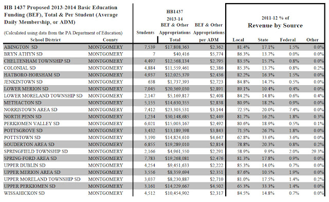"As you see in the attachment, Pottstown gets the largest per-student amount of any Montco school (Aside from Bryn-Athyn and their 7 students) and receives the largest percentage of their total funding from the state," Stoll wrote in his e-mail to me.