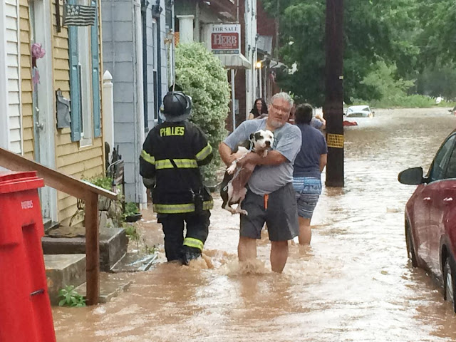 Photos by Evan Brandt Walnut Street Pete Santiago rescue his dog from flooding during the July 11, 2019 storm. |