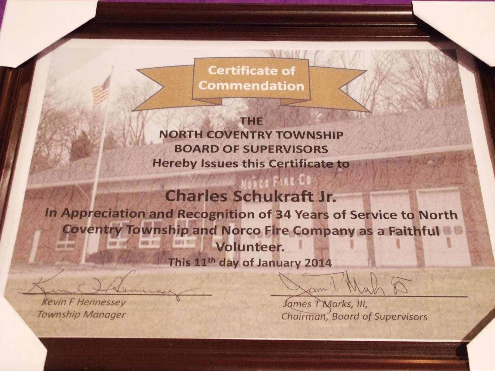 He was fire chief from 1973 to 1986 and again in 1990. He is a past fire marshal and was directly involved with rescue efforts during the 1972 disaster of Hurricane Agnes.